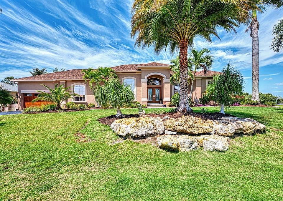 Searching for your own paradise oasis near the natural splendor of Myakka State Forest? This fantastic 3-bedroom, 2.5-bath, GULF OF MEXICO ACCESS waterfront residence in Gulf Cove could be just what you’re looking for! Your boat will be ready for you on the covered 13,500# lift!!! Professional landscaping and lighting enhance the curb appeal of this extraordinary single-story dwelling set on a generous lot. Brand-new beveled-glass double doors greet you as you enter, revealing a stunning foyer where 12 ft ceilings, elegant crown molding and wainscoting, wide windows, and neutral tones extend throughout the abode. An oversized ceiling fan stirs the breeze above the living room, where a dark wood accent wall beautifully contrasts with the pale tile work underfoot. Large glass sliding doors create a seamless flow to the broad lanai, expanding the entertaining space for any gathering. A stylish chandelier holds sway over the adjoining dining corner where you can host intimate candlelit meals, sumptuous celebrations, or fabulous buffets. Just off the foyer, your home office features rich wide-plank flooring and a handsome Amish-made Murphy bed that will impress overnight guests. Continue towards the chef-inspired kitchen with its gorgeous cabinetry, stainless steel appliances, chic backsplash, and granite countertops that extend to the breakfast bar and prep island. Sip coffee and unwind in the window-side breakfast nook, where wood-style flooring cascades towards the connected family area. Retire to your comfortable retreats, including the enviable primary suite with its two walk-in closets, plantation shutters, personal door to the patio, and a lavish ensuite featuring a window-side soaking tub. Enjoy the recently resurfaced heated saltwater pool with its attractive water features, or relax in the 6-person spa under the upgraded pool cage. Head down to the adjacent canal front, where a covered 13,500# boat lift makes give you easy to the open waters of the Myakka River or the Gulf of Mexico for a day of fishing or sightseeing. Notables include a laundry room with ample counter space and cubbies, NEW METAL ROOF 2023, dual zoned A/C system with electronic filtration, 2 detached storage sheds, an attached 2-car garage with new hurricane rated overhead door and a security system. Some furnishings optional. Entertainment center in family room does not convey. Maintain an active lifestyle at 5 nearby beaches, golf courses, and New Centennial Park where you’ll find walking trails, various sports courts, and a fitness center. Sports enthusiasts can watch athletes in action at the Atlanta Braves Spring Training at CoolToday Park or Tampa Rays Spring Training at Charlotte Sports Park. Visit local shops and restaurants, or take a day trip to Tampa, Orlando, or Miami for additional dining and leisure options. Catch fish right from your dock (see photos), Charlotte Harbor, or experience catching a monster Tarpon at nearby world famous Boca Grande Pass. Walk though the home with the interactive virtual tour. Come tour this amazing home to see all it has to offer!