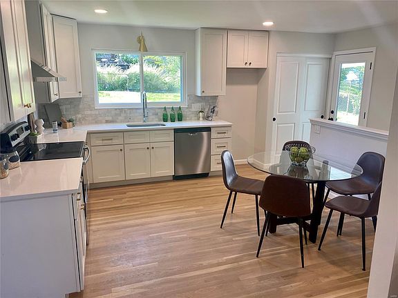 Beautifully renovated 3 bed, 2 full bath home fully updated w/a designer touch! The exterior greets you with painted brick, black windows & updated front door. Inside, custom stained, white oak, solid hardwood floors span the entire first floor. New kitchen w/white cabs, ss range hood, ss appliances & white quartz countertops. Light filled, spacious family room. Master suite w full bath w marble floors & large, tiled shower. 2 additional bdrms. Full hall bath w black hex floors, tiled tub/shower, white oak vanity & black fixtures. Large living area & additional room in bsmnt w new carpet. Fenced yard w covered patio for dining & lounging. New windows, furnace & electrical panel. Rockwood school district. 2 min to hwy 44. Some Accessible Features