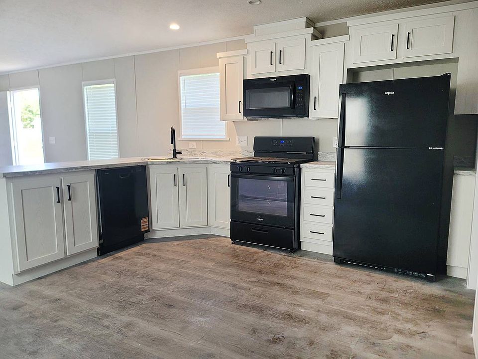 Vinyl flooringBlack kitchen appliancesWhite cabinetsLarge primary bedroomPrivate bathroomWalk in closet