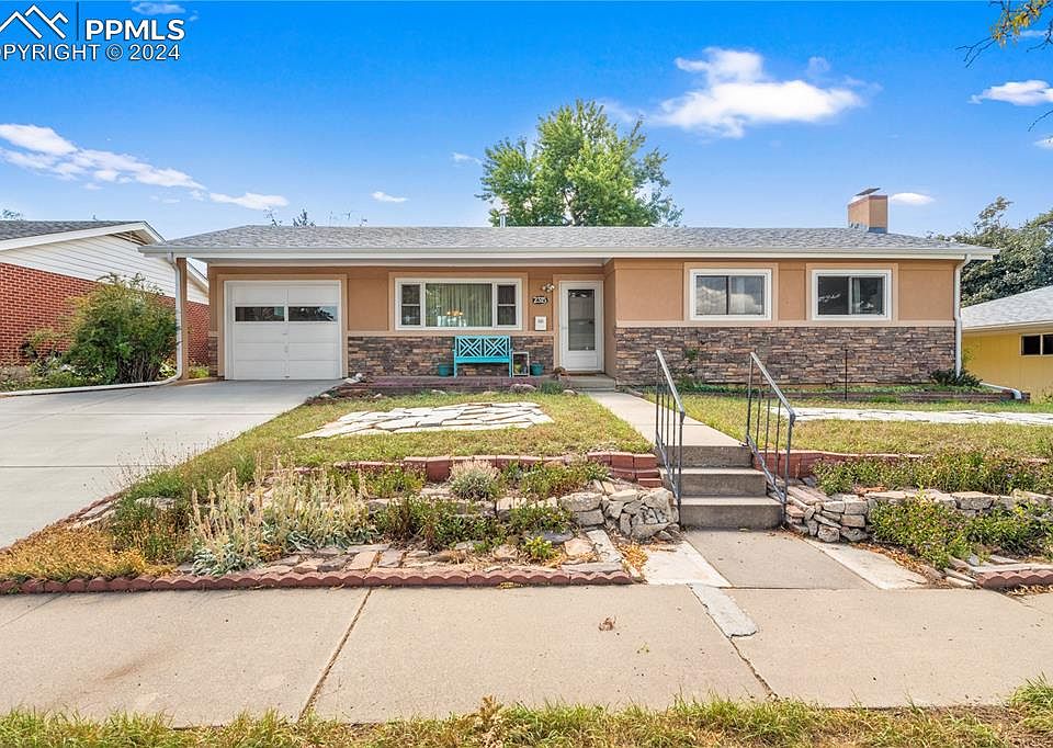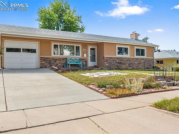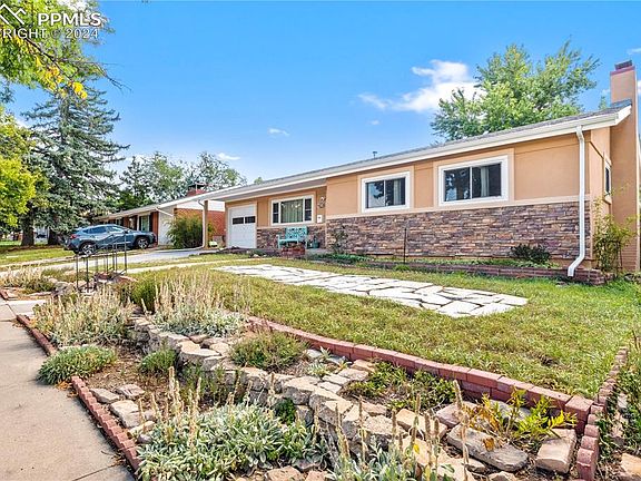 This charming 4-bedroom, 3-bathroom ranch-style home offers views of Pikes Peak and the front range with an ideal blend of comfort, style, and location with great bones waiting for your custom touches. Spread across a spacious main level with full basement below, this home is designed for easy living and entertaining. The open-concept layout features a sun-filled living room with large windows that opens to a generous dining room and wonderfully laid out kitchen featuring ample cabinet space that flows seamlessly to the outdoor covered patio. Just down the hall you'll find 2 spacious main level bedrooms, a full bath and the 3rd bedroom, the primary, with en suite. Down stairs opens to a large great room with a large brick fireplace. Off to the side you'll find the 3rd bath and the 4th bedroom, that can easily function as an office, featuring beautiful built-ins and a desk. Beyond the great room is a large bonus room featuring a cedar lined closet, an additional closet and space to spread out. Off to the side you'll find the large laundry room. Stepping outside from the kitchen, you'll find the large 15x30 patio, with 15x18 covered, where you'll enjoy the peaceful backyard, ideal for barbecues, outdoor activities, or simply relaxing and soaking in the mountain views while enjoying the health benefits of the labyrinth walking path. With room for gardening or recreation, the outdoor space is both tranquil and versatile. The home also features a garage and plenty of storage. Located in a desirable neighborhood with easy access to parks, shopping, dining, and schools, this home offers the perfect combination of scenic views and everyday convenience. Don't miss the opportunity to make this beautiful property yours!