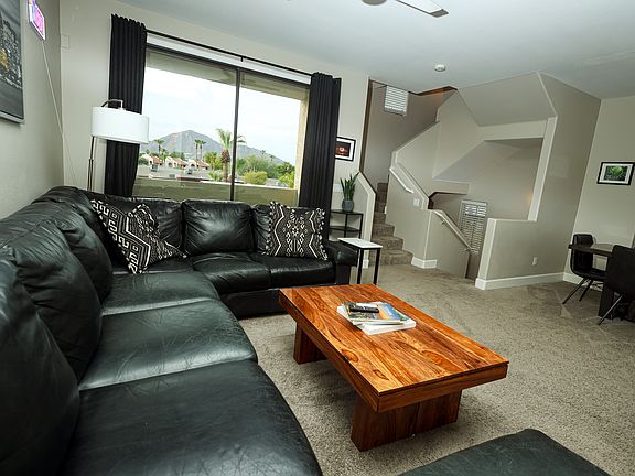 FULLY FURNISHED Beautiful Tri level townhome in gated community with community pool! 1 bedroom 1 bath on main level , 2nd bedroom and bath on second level , 3rd bedroom and 4th bedroom (master) with en suite on third level. Neutral colors throughout home. Kitchen has granite countertops and new stainless steel electric stove, microwave and dishwasher. Lots of windows and natural light. Primary bedroom and living room has great Camelback Mountain Views!! Close to the freeway, airport, Scottsdale old town. Renter pays all utilities except water. 1 months rent for security deposit. 2 car garage is attached and free guest parking on site. EV Charger in garage.