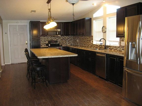 UNBELIEVABLE PRICE....GREAT INVESTMENT.................... This spacious triple-wide home is located in beautiful Four Lakes, a 55+ gated community with homes on lot leased land. Here you own the home and not the land. A monthly lot rent of $612.00 allows you and your guest to enjoy the amenities of the community........... This beauty features a split floor plan, three bedrooms, two baths, formal dining room plus a den, tape and texture, arches, skylights, newer awnings, garage and golf cart shed. The large eat-in kitchen has been updated with beautiful cabinets, counter tops, a nine foot island, and LG appliances. Over $20,000 has gone into this dream kitchen........... The large master bedroom has a spacious walk-in closet plus and extra closet and the master bath features his and her sinks, garden tub, and a walk-in shower. You will love relaxing in the oversized,,,finished Florida room with a bank of glass windows revealing a beautiful view of the golf course, pond and trees!.......... This home also has a garage and a golf cart shed with its own driveway. Yes, the golf cart is included!.......... This home is being sold "as is" at a fantastic price. Owner is very anxious for a sale. A little paint and possibly some new carpet can make this home almost double in value. This is a must see! Pictures available soon!!