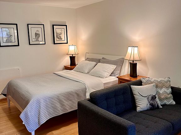This fully furnished studio apartment has everything you need while you are in Corvallis. The large room includes a queen-size bed with linens, TV, couch, and dressers. There is an efficiency kitchen with a hot plate, microwave, coffee maker, mini-refrigerator, and all the essentials you'll need to make simple meals. The spacious bathroom has a shower/tub combo and two sinks--one kitchen sink for washing dishes and a regular bathroom sink.