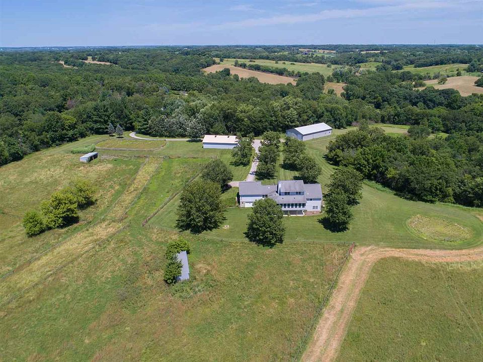 PICTURESQUE IOWA LANDSCAPE with majestic rolling hills, open land and dense tree line. The private wooded entrance leads you to this private 47 acre homestead with high elevation and sensational vistas. Custom-built, one-family owned home with geothermal, wood floors, Andersen windows and granite counters throughout, main floor ensuite master bdrm, 1st flr laundry area, spacious 4 seasons rm, walk-out LL with full kitchen, theatre rm and surround sound. Equestrian dream with 3 pastures with no-climb fence;