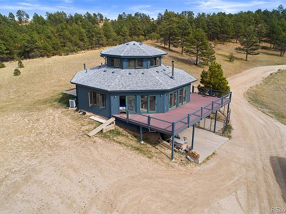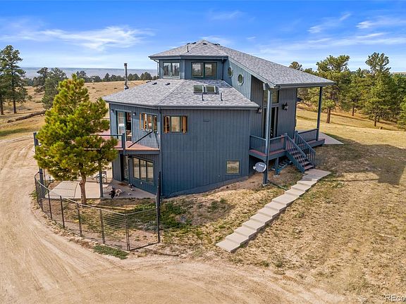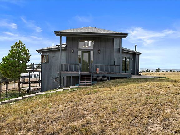One of a kind custom built Octagon home situated on a very private 39.86 acres! Gorgeously treed property with splendid front range mountain views, prominent views of Pikes Peak and well beyond. If you are looking to escape the hustle and bustle of the city life and all its surroundings, this is a must see property! Very private, one of kind rarity octagon custom built home, with an upper level almost 360 observation room/great room/bonus room surrounded with windows, multiple patios and decks, maximizing the splendid views with stunningly gorgeous unobstructed sunrises and sunsets, offering lots of windows in maximizing the views and natural lighting. Very room and bedroom offers a different aspect and view of the property. This property offers total privacy, from heavily pine treed to gently rolling meadows in others, offering ultimate privacy. This custom octagon home offers a large open kitchen, with an abundance of hickory cupboards, counter space, kitchen pullout drawers, granite counter tops, newer skylights, tiled flooring, knotty hickory doors and baseboards, large living room w/wood burning/pellet stove, lots of windows with numerous access points to a large deck approximately (44' x 12') to enjoy an evening glass of wine or barbecue to the breath taking sunsets or entertaining friends and family. The main floor offers a master suite w/master bath, 2nd main floor bedroom which has an adjacent patio approximately (22' x 12'), walkout basement with access to a oversized 2 car attached garage with a large workshop area, large mudroom, large laundry room with a utility sink, bedroom and bathroom. This home is one of a kind, zoned agriculture, has its own private domestic well, leach field and sewer tank, leased propane tank, approximately a 256 SF utility shed on the property for storage or other uses. This property is conveniently located to Highway 86, has well maintained county and private roads to Kiowa, Elizabeth, DIA, I-70, Limon, or Denver.