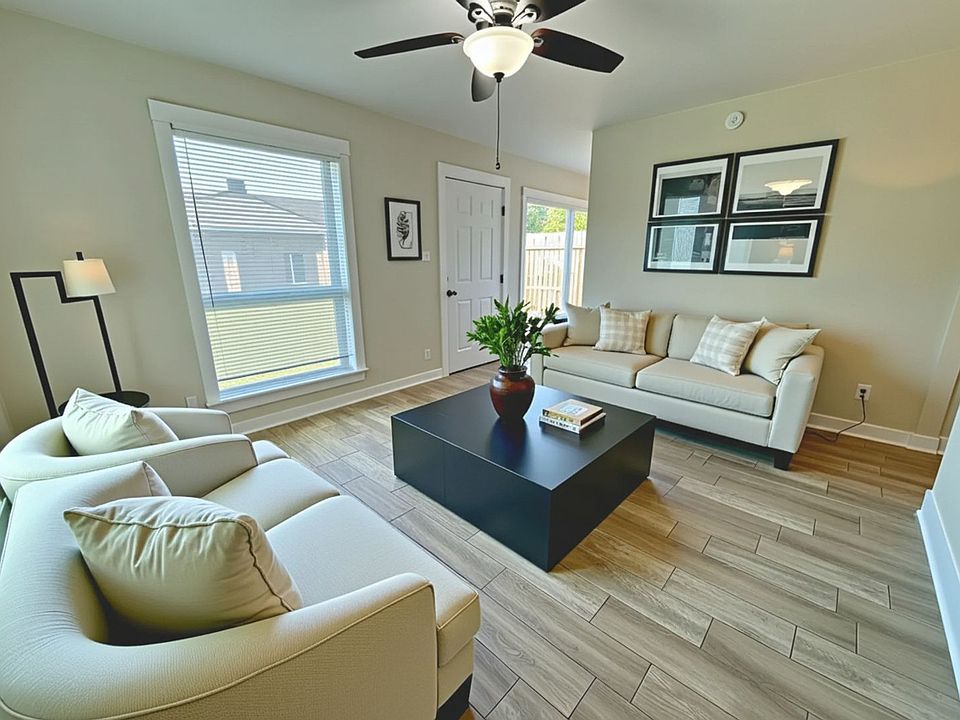 Laminate flooringCeiling fansVaulted ceilingsDeep tub showerAll black appliancesGated patio