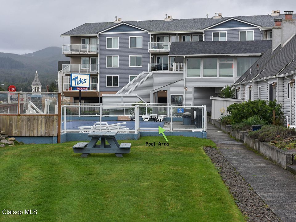 The Tides is Seasides most popular condo complex. NOTE: this is a Studio unit, 405 sq ft, fireplace, ocean front, great ocean views, furnished. Swimming pool, and outdoor picnicking area, and world famous clamming. Only steps to beach for surfing, fishing, clamming or sitting by a beach campfire. Short walk on the Prom to downtown Seaside for shopping and fine dining