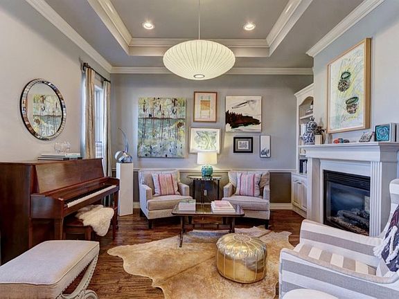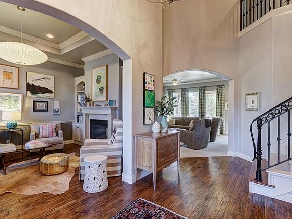 The crown molding, hand scraped wood floors, exquisite light features, window treatments, and white and gray palette, make this home magazine worthy! A fireplace is shared between the family and formal living rooms. Love to cook? Limestone countertops, stainless appliances, dbl oven, gas range, coffee bar, and pantry. The butler's pantry (with a wine cooler) is the perfect proximity to the formal dining. Warm up by a fire in the library or retreat to the master with wood floors, a fireplace, and access to a private patio. The suite meets perfection with a wrap around shower, jetted bath, 2 walk-in closets, 2 sinks, and TV. Upstairs holds a large bonus room, 3 bedrooms, 2 bathrooms, & storage. The backyard has been professionally designed and backs up to an empty wooded lot. Multiple evergreens provide seasonal color and shade. Gas/wood burning fireplace anchors patio next to pool for fun in summer or winter. Pool has 2 waterfall fountains, providing lovely ambiance. Exceptional!