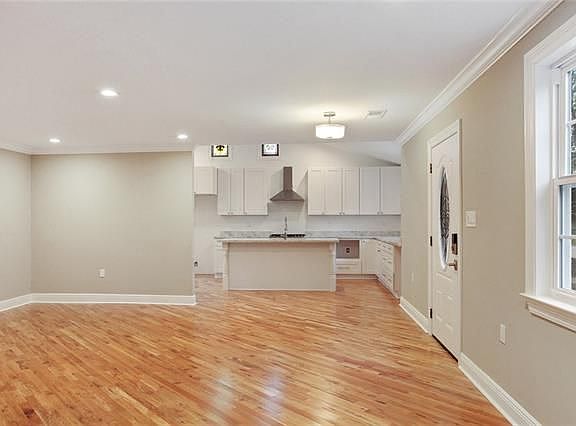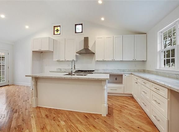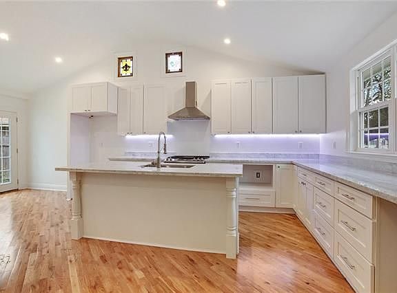 The inside will WOW you. Like new Gutted to the studs, quality work with designer colors. Huge den with solid wood-floors and lots of natural lighting. This home has cathedral ceilings in the kitchen with a lg island w/built-in sink, stainless appl, granite & two stain-glass windows. The Master suite is perfection from the solid wood-floors to the two stressed barn doors for his/her closets. Bathrooms deluxe renovations/Total NEW pitched roof with new hardy-plank. New wooden deck, landscaped and more.