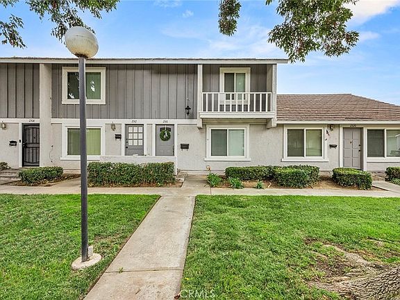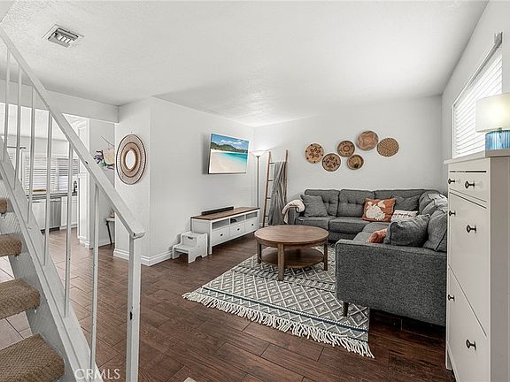 Beautifully maintained Palm Gardens home. Very well located in this highly sought after development with beautiful mature trees and open greenbelt as you enter in the front. You really do have a private feel and room to roam with a spacious patio and yard area between the home and large 2 car detached garage. The downstairs is very open with a separate living room connecting to a spacious eating area that is open to the kitchen. The kitchen is updated with newer cabinets, countertops, and decorative tile backsplash, as well as stainless steel sink and appliances. The downstairs also features wood tile flooring, a well appointed 1/2 bath and large slider leading to rear patio/yard. All bedroom are upstairs. The Master bedroom is large with a double door entry, natural light, and an over-sized closet. The two additional bedrooms are spacious and boast custom shutters. All bedrooms have newer ceiling fans and are closely adjacent to the full bath, which is in great condition with tile surround in tub/shower area and granite countertop at sink area. The community features very spacious greenbelts a community pool and spa, and outdoor cooking/picnic area, and playground. Award winning schools, and close to parks and shopping.