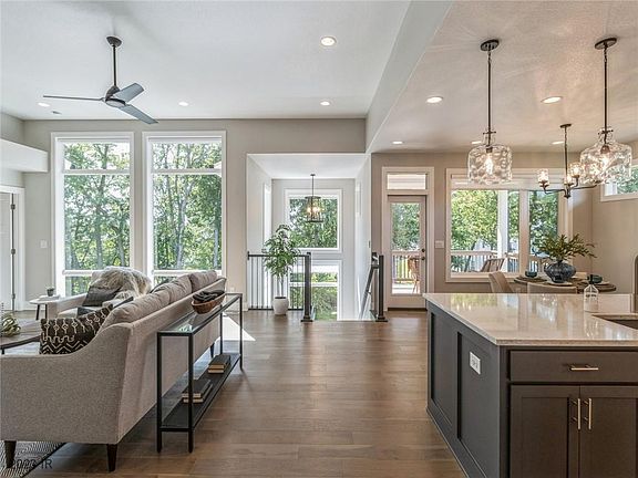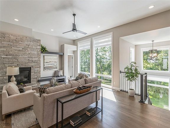 Incredible WALKOUT RANCH in the Heritage neighborhood of Grimes. I'm not sure where to start. This home's curb appeal is impossible to miss...frosted glass garage doors, custom stone and siding, three adjacent open lots to the north, and mature trees in the backyard. The main floor features 11' ceilings with the pièce de ré·sis·tance being 10' floor-to-ceiling windows, made even more breathtaking by the mature trees and west evening sun. The atmosphere in this home is beautiful, peaceful, & private. In the kitchen you will find quartz countertops, a gas cooktop, white tiled backsplash, double convection wall ovens, and a walk-in pantry. Continuing the open concept, the kitchen connects to the dining area which overlooks the covered deck. The primary suite certainly does not miss out on the beautiful views & light; it connects to a large bathroom with a zero-entry shower and closet with professionally designed storage. This primary suite then comes full-circle and connects to the laundry room and drop zone. Finishing out the main level is a bedroom, office, and full bathroom. The walkout basement includes a wet bar with full sized fridge, family room, two bedrooms, another full bathroom, and a large storage room. Don't miss out on this home! There's nothing like it.