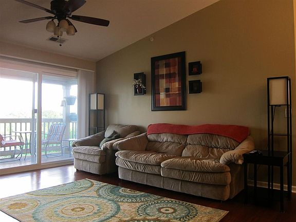 Very well kept Top floor unit with Vaulted ceiling, Fireplace, beautiful Wood floors, open kitchen, split bedrooms, Master BR w/walk-in closet & attached bath, deck w/great views overlooking woods, both full baths updated with Ceramic tile floors, fully equipped kitchen, nice fixtures, washer, dryer, move-in ready, attached oversized garage w/direct access to building, includes water/sanitation.