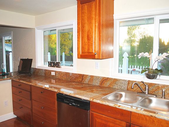 BEAUTIFUL REMODEL, NO EXPENSE SPARED. Custom cherry kitchen cabinets, stainless appliances, canned kitchen lights, floor to ceiling pantry, eating bar, new granite counter and Jatoba wood laminate flooring, lots of kitchen light. Perfect for entertaining formal LR, huge FR, formal DR. New flooring, paint, bath vanities, interior doors, trims. Heat pump, 2 car garage. Fenced stream side backYD, lg. deck for BBQs, watch wildlife and mountain views, as well as a grass yard for garden and play.