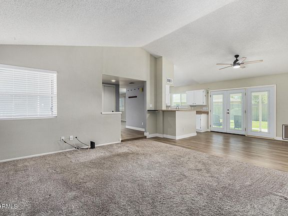 Welcome home! This inviting 3-bed, 2-bath, No HOA residence offers a 2-car garage and low-maintenance landscaping with artificial turf. The living room welcomes you with vaulted ceilings, a soothing palette, and a mix of soft carpet and wood-look flooring. Enjoy cozy evenings by the inviting fireplace in the family room. The kitchen features white cabinetry, stainless steel appliances, and a two-tier peninsula with a breakfast bar for casual dining. The main bedroom has a private bathroom for added comfort. The backyard includes a covered patio, a storage shed, and a large lawn for outdoor activities. Conveniently located near San Tan Park, shopping and schools. Make it yours today!