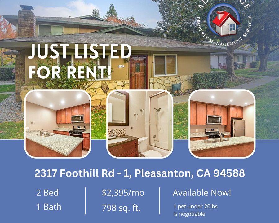 Schedule a Showing Online Come to see this updated 2 bedroom, 1 bathroom, 798 sq. ft. condo located in west Pleasanton off I-680 and Bernal. The home opens into a beautiful living room with a fireplace. Next to the living room is a remodeled kitchen that includes granite counter tops and stainless steel appliances. The home also features laminate flooring throughout. The Laguna Vista Estates community offers access to a community pool, spa, and coin-op laundry. The owner is looking for a long-term tenant who will take excellent care of the house. Date Available for move-in: ASAP Rent: $2,395/month Security Deposit is $2,395. Applicants that do not meet all the Basic Criteria, but exceed the Minimum Criteria, may be approved. If you join Obligo, you will not be required to pay a security deposit! Preferred Lease Term: 14 months Pet Policy: 1 pet (Dogs ok, Cats ok) under 20 lbs is negotiable with a$30/month pet admin fee for the pet. Applicants with pets are required to submit a pet application through a third-party pet screening service as part of our rental application process. Refrigerator: Included Washer/Dryer: Coin-op on-site Parking: 1 assigned, covered parking space Utilities Included: Garbage and water Showings are available by appointment only. Schedule a showing online by clicking the Schedule a Showing link. The property is professionally managed by Advantage Property Management Services. Leasing Contact: Michelle Cowley (DRE# 01924303) READ THIS IMPORTANT INFORMATION BEFORE YOU SCHEDULE A SHOWING There is a $50/adult non-refundable application fee and ALL adults residing in the property must apply. We will (1) verify your identification; (2) check your credit report, unless you receive a Government Rent Subsidy and request to provide verifiable alternative evidence instead of a credit report no later than when the application is submitted; (3) verify your household income and employment, if applicable; and (4) verify your rental history with previous landlords. Most applications are processed in 2-3 business days from the date we receive a completed application and all supporting documentation. Security Deposits are calculated using a risk-based model. Applicants who meet all the Basic Criteria may be approved at the advertised security deposit amount. Applicants who do not meet the Basic Criteria but exceed the Minimum Criteria may be approved with a higher security deposit, not to exceed the legal maximum. We offer a security deposit-free option for qualified tenants using Obligo billing authorization technology. Security Deposits for active-duty military and properties subject to AB12 cannot exceed 1x the rent. Prior to move-in, proof of a current renters insurance policy with APMS listed as an Additional Interest and coverage of at least $300,000 for personal liability must be provided. Please DO NOT APPLY if your credit score is below 650, your household income is less than 2.7x the asking rent, you have ever been evicted, you have negative rental history, or your pets do not comply with this propertyAx83A??s pet policy. If you have a Government Rent Subsidy and elect to provide verifiable alternative evidence of your reasonable ability to pay rent instead of a credit report, you must inform APMS when you submit a rental application. Failure to notify us at this time may disqualify you from participation in alternative verification. We will provide a list of required documentation after we receive a request. All documentation must be provided within 48-hours. Contact us to learn more about this process and the required documentation. All verifiable sources of income will be considered. Pursuant to CA Gov. Code 12955(o), the income multiple is based on the amount of rent that will be paid by the Applicant (not the total rent amount) if the Applicant has a rental voucher or other housing subsidy. To help ensure all residents understand our animal policies, all Applicants must submit an animal application at https apms. All Information Deemed Reliable But Not Guaranteed. APMS is not responsible for content published by third-party listing websites (i.e. Zillow, Trulia, Hotpads, etc). Central Heat/Air Community Pool Community Pool/Spa Disposal Garbage Service Included Pets Allowed Refrigerator Included Views