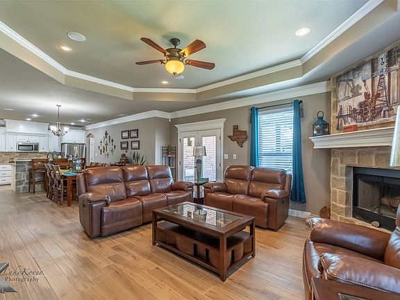 This 3-bedroom, 2-bath home offers a perfect blend of modern comfort and stylish design. The open floor plan features granite countertops throughout, ceramic wood-look tile in common areas, and carpeted bedrooms for warmth and comfort. The kitchen is a chef's dream with soft-close cabinetry, glass-front accents, a large island, stainless steel appliances, and a reverse osmosis drinking water system. Corner Stone Fireplace is a focal point in the main living area. Enjoy the luxurious primary suite with a soaking tub, separate shower, and elegant finishes. The home includes smart features such as a Ring doorbell, hardwired security system with window and door sensors, and Bluetooth-connected sound system for the living area and back patio. Exterior highlights include stained wood porch ceilings front and back, outdoor accent lighting, gutters around the entire home, concrete-coated front walkway and back patio, out back enjoy dreamy backyard complete with gazebo and a hot tub. HOA beautifully maintains the yard with mowing, edging, fertilizing, and weed control included, along with a walking path in subdivision. Painted garage floors add a clean finish. Zero lot line. Whole home water filtration system and softener.