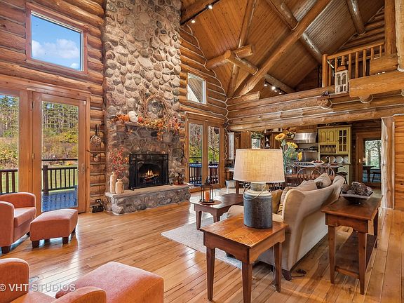 Detailed craftsmanship and thoughtfully curated ~ This 4-bedroom custom log home, featured in Log Home Living magazine, sits on 5 private acres and is the perfect country retreat! Nestled among the pines at the edge of the Brookdale Conservation area and just 5 miles from historic downtown Woodstock, this gorgeous gated estate property has it all. The inviting front porch opens to main floor living that includes hickory hardwood and slate flooring, soaring great room ceilings filled with natural sunlight, massive stone fireplace, gourmet kitchen with custom-built cabinetry, solid surface countertops, Viking appliances, 3 season room, huge mudroom with laundry, walk-in shower that could be converted into a dog wash and custom reclaimed barn wood cabinetry. The primary bedroom suite has a luxury bath with double sinks, enormous walk-in shower, and imported spa bath. The second floor features an open loft space for use as an office or den, 2nd guest bedroom, walk-in closet, and plumbing ready for a third full bath. The finished lower level provides more gathering space in the family room with fireplace, 3rd and 4th bedrooms, and full bath. Walk out to the lower private patio leading to the beautiful deck showcasing the expansive views and outdoor fireplace. The circular drive wraps around from the 2 car garage to the beautiful custom-built 30 x 77' barn with concrete floors ready for toys, animals, or use as a large-scale entertaining space. Make this natural sanctuary a place to escape and create new traditions!