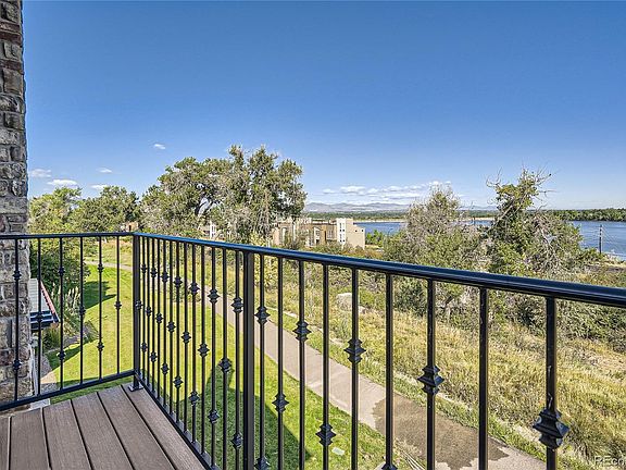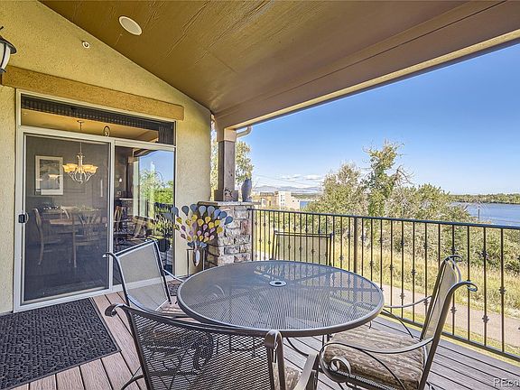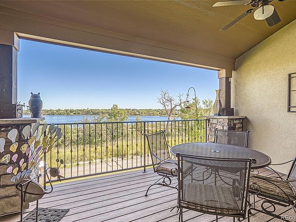 Amazing luxury townhome with water and mountain views in a 55+ community! Quality custom finishes abound throughout this home including dark wood floors, crown molding, coffered ceilings, wrought iron, hand-troweled drywall texture, superior soundproofing and beautiful tile! As soon as you walk through the front door you are greeted by the soaring ceilings and views of McLellan Reservoir. In addition to water and mountain views, the great room features a 2-story stone fireplace! The gourmet kitchen has a large eat at island, gas cooktop and double ovens. The cabinetry was expanded into a well-designed drop area off the garage that includes additional storage space, a seating area and bookshelf. The 2nd floor master suite is the perfect retreat with vaulted ceilings, water views, mountain views and a private balcony. The upgraded 5 piece master bath has a frameless glass shower, soaking tub, quartz counters and dual sinks. The walk-in closet has been upgraded with cedar wood flooring and a custom closet system. A spacious home office is also located on the 2nd floor. The lower level walkout has a great room, gaming area, bedroom, bath and storage. The gaming area was pre-plumbed for a wet bar. The bedroom contains a murphy bed creating the perfect flex space for your needs. 3 outdoor spaces allow you to enjoy the stunning views. The main floor deck is covered and located directly off the dining room and great room. It is the perfect place to enjoy a meal or relaxing with friends, regardless of the weather. The lower patio is also covered and provides another space to enjoy the wonderful Colorado weather. The 3rd space is the private balcony off the master suite with even more stunning mountain and water views. This home has a Sonos sound system including whole house entertainment equipment, built in speakers and a rack mount for all your electronics! The Highline Canal Trail runs directly through this community, providing easy access to walking, running or biking!