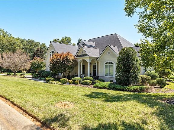 Custom-built brick estate on the 12th tee of Tot Hill Farms Golf Course, offering privacy with no homes on either side and sweeping golf views from a 12x44 screened porch with porcelain tile. A grand foyer with curved staircase leads to cathedral ceilings, exposed beams, and custom built-ins. The dramatic stone fireplace is double-sided, enjoyed from both the living room and the main-level primary suite. The remodeled kitchen features painted cabinetry, quartz countertops, new Elkay sink, and sitting room with courtyard access. The primary retreat offers a tray ceiling, porch access, spa-like bath with soaking tub, glass shower, and oversized walk-in closet. Upstairs includes two en-suite bedrooms, a bonus room, and walk-in storage. Outdoor living shines with a slate front porch, private courtyard, and screened porch with swing bed. Oversized garage with golf cart bay completes this refined residence. Video https://listings.mmtriad.com/videos/01993944-c83e-7213-88b0-30b0e6ca9118
