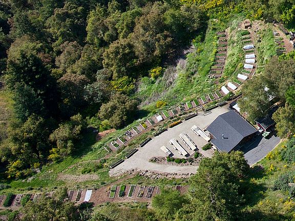 20 acre sunny mountain compound with two residences, multiple outbuildings and iconic terraced garden. Landscaped patio area with built-in pizza oven, gazebo, fruit trees and permanent firepit, as well as a pool.