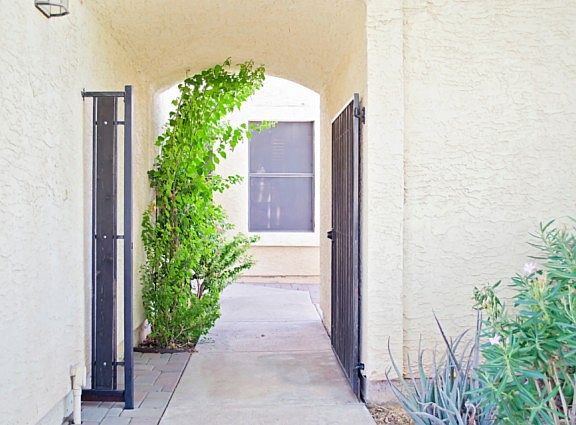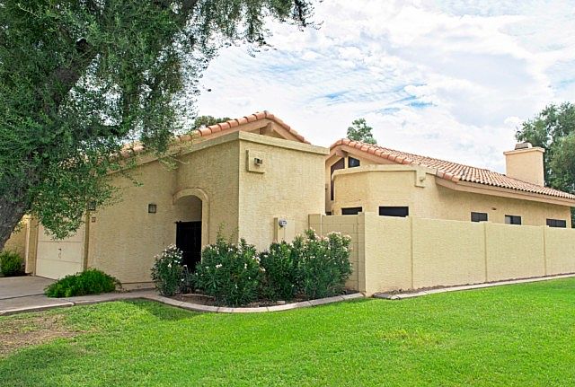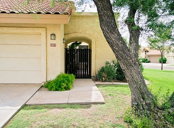 This townhome is turn key ready and in a fabulous location in Chandler close to the 101, Chandler Fashion Center, ASU Research Park, and within 20 minutes of Sky Harbor Airport. When you step inside this home, the first thing you will notice is travertine and pergo wood flooring (this flooring is throughout the entire home, no carpet). The natural light is let in by numerous windows, and the architecture features high, vaulted ceilings. The spacious living room is situated around a cozy fireplace. There are two full bathrooms and both have been updated in 2013 with granite counters. The master bathroom features a double vanity and garden tub. The eat-in kitchen, also updated in 2013, has granite counter tops, a double oven, stainless steel refrigerator, vaulted ceiling, and upgraded lighting. The patio surrounding the home, is bricked with Astro Turf areas already installed. The Heatherbrook community features walking paths, tennis courts, and a community pool!