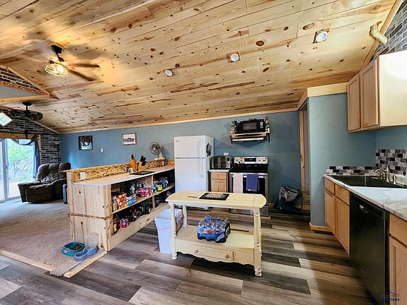 Step into charm and modern elegance with this beautifully renovated 2-bedroom, 1-bath home that perfectly blends character and contemporary comfort. Nestled in the breathtaking Southern Hills of South Dakota, this home offers peaceful surroundings with the convenience of being just a quick 20-minute drive to the lake, 20 minutes to Custer State Park and 40 from the monuments—perfect for weekend getaways, fishing, or summer fun. From the moment you enter, you'll be captivated by the exquisite woodwork and thoughtfully designed updates throughout. The heart of the home features soaring vaulted ceilings in the kitchen, dining, and living room, creating an open, airy feel that's perfect for entertaining or relaxing in style. Brand-new flooring runs throughout the entire home, adding a fresh, cohesive look while complementing the warm tones of the woodwork. The kitchen has been tastefully updated to offer both functionality and flair, flowing seamlessly into the dining and living areas for easy everyday living. A spacious laundry room adds convenience and versatility, offering extra storage and workspace. Both bedrooms are bright and inviting, with natural light and comfortable layouts. Whether you're a first-time buyer, downsizing, or looking for a stylish, move-in-ready space surrounded by natural beauty, this home is a true standout. Don't miss your chance to own this one-of-a-kind gem in the heart of the Southern Hills—schedule your showing today!