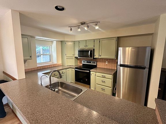 You will love the bright, open layout of this tri-level home. The spacious living room has vaulted ceilings with skylights and a cozy fireplace. The living space opens to the kitchen and dining nook. Upstairs you will find two bedrooms and two bathrooms. The lower level has an addional living/flex space and half bath. This area does have a closet and could be used as a third bedroom if desired. The backyard is a cozy, private space perfect relaxing and enjoying the mature landscaping. Two car attached garage. Washer and dryer provided. One pet is allowed with an additional pet deposit. Flexible lease term from 6-18 months.