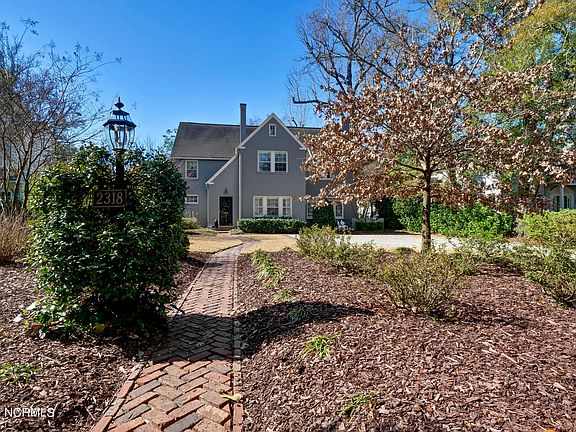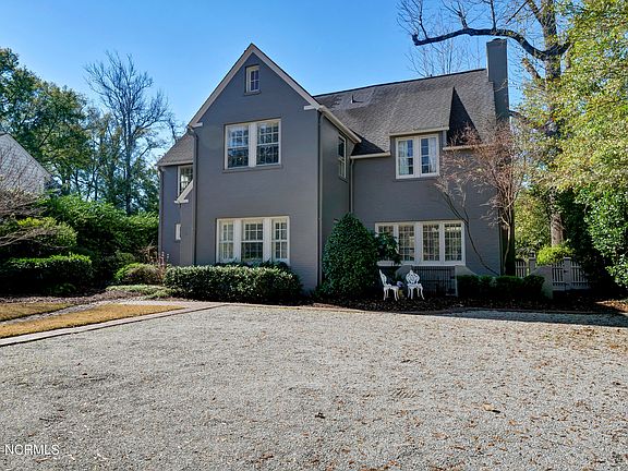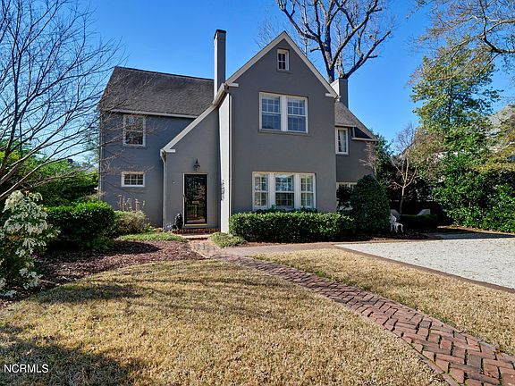 English charmer in the heart of Wilmington. Enter on a gravel drive under majestic trees to a professional landscaped yard that welcomes everyone. This painted brick home features 3 bedrooms and 2 1/2 baths on paper, however, the spacious office off the main bedroom offers many possibilities as well and the 3rd floor room that has served as a 4th bedroom, studio, or playroom over the years. This 3rd floor also has a walk-in attic with tons of storage and floored space. The cozy den features custom book shelves, gas fireplace, and access to updated stone patio and fenced in yard. There are formal dining and living rooms as well. Updated kitchen has old world feel with modern conveniences. The covered back porch offer a serene setting for entertaining or relaxing. The 2 car garage has a charming one bedroom apartment above it that is currently rented for $1000 a month through 9/1/2024. An additional 761 sq feet features one bedroom loft, complete with kitchen, full bath, and eat in area. Located just minutes from Whole Foods, Independence Mall, great restaurants, Medical Centers, Downtown, and the Cross City Trails. Only 10 miles from Wrightsville Beach. Come take a look as this gem won't last long!