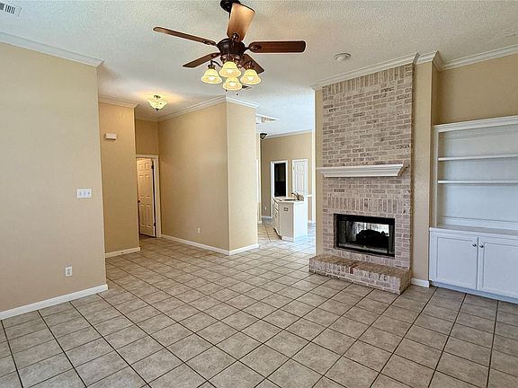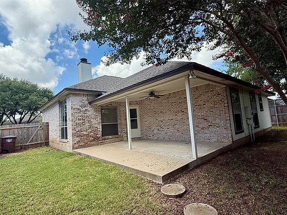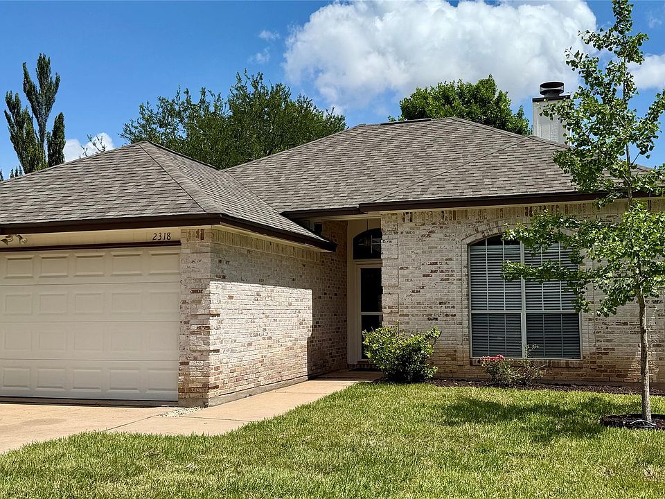 Welcome to South Creek! One story, beautifully maintained one-story home with over-sized covered patio, fenced backyard with large Morgan storage unit, established trees & neighborhood sidewalks. Gorgeous double-sided gas fireplace adorning living area & breakfast area. High ceilings, plenty of natural lighting, window coverings & ceiling fans thru-out. Primary bath updated with spectacular separate shower! Storage galore! Hard surface flooring in Living, Kitchen and Primary bedroom. Water softener, 2-car garage with overhead door opener & indoor utility.