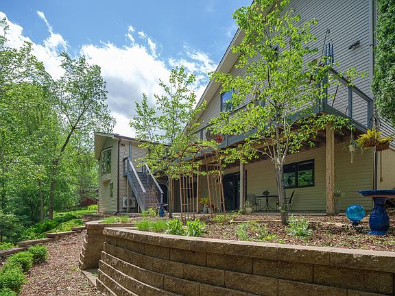 Architecturally Bold. Naturally Private. A Hidden Gem Just Minutes from Downtown. This architecturally distinctive home offers a retreat nestled in a wooded, expertly landscaped cul-de-sac setting. With a striking design that nods to mid-century modern influences, the home features textures, clean lines, and dramatic angles, creating a visually compelling and livable space. Discover a thoughtfully updated interior meticulously cared for over the years. The main living room exudes warmth with a gas fireplace and large windows inviting natural light and serene views of the surrounding trees. Nearby, a second family room offers another cozy gathering spot, complete with its own gas fireplace and a picture window that frames the outdoors like artwork. The open-concept layout flows easily between formal and informal dining spaces, providing the ideal setting for casual meals and elegant entertaining. The kitchen is spacious and highly functional, designed for those who love cooking and gathering. It offers abundant cabinetry, generous hard-surface counter space, and seamless access to a beautifully appointed overflow pantry/mudroom, perfect for managing the extras of everyday life. Upstairs, the expansive primary suite offers a peaceful and private retreat, while an airy loft provides a flexible open space perfect for reading, music, or quiet reflection. Bedrooms and bathrooms are thoughtfully distributed across all three levels, offering privacy and space for every household member and ample room for guests. The lower level continues the home’s generous layout with yet another inviting family room with a third gas fireplace. This space walks out to a secluded patio surrounded by trees, creating a private outdoor lounge ideal for morning coffee, evening gatherings, or quiet moments. Outdoors, the living continues with a sprawling deck and multiple patio areas designed to make the most of the home’s peaceful setting. The expertly landscaped grounds enhance the feeling of escape, while a pre-stress storage space provides smart, convenient storage for gardening tools or seasonal gear. Located less than ten minutes from downtown, this home offers a rare combination of architectural character, privacy, and location. It’s been lovingly maintained, tastefully updated, and thoughtfully lived in. If you’re looking for a distinctive and deeply comfortable home, this one is a must-see.