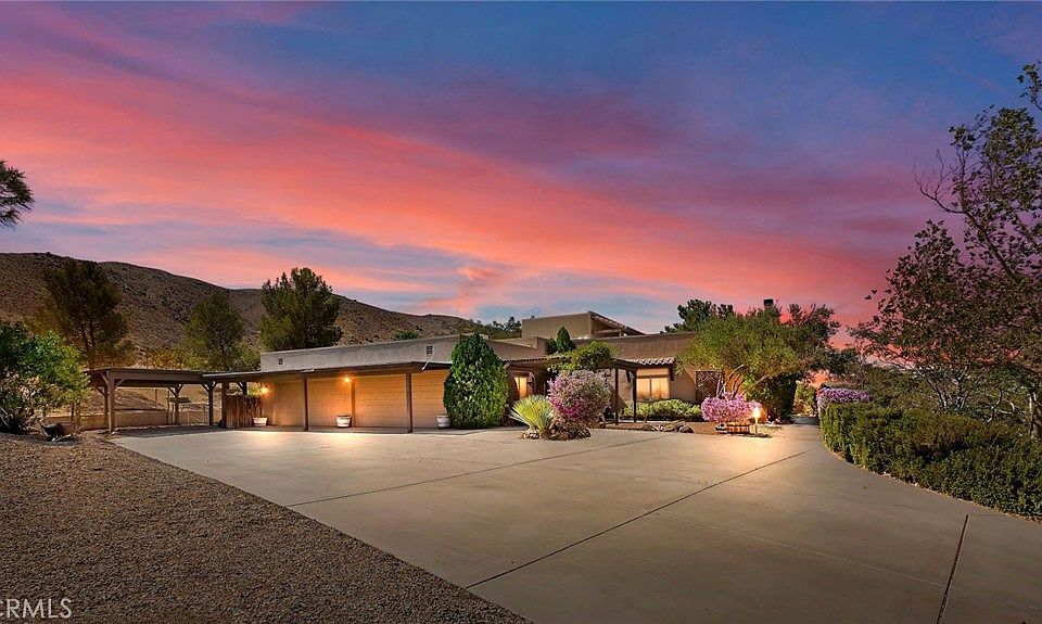 Beautiful custom-built estate located in Apple Valley, California. This modern Spanish style home's premier exterior features include beautiful custom stairs leading up to the residence, with a "peek a boo" view of Apple Valley desert below. Also exterior of home features mature trees, beautiful desert landscaping, many different types fruit trees, a four-car garage attached, and a detached RV garage+ 2 car garage and a full bath. Once inside the home you will be impressed with the many charming extras found throughout this custom home. As you enter the residence you enter the nice sized family room with beamed ceilings a cozy wood burning fireplace, a wet bar and adjoining country kitchen with lots of custom cabinets, double oven, and island with a vegetable sink and built in 5 burner stove top and lots of counter space. The main bedroom has a private patio, electric fireplace, 2 separate walk-in closets with cedar lined walls. The main bath has large custom walk-in shower with a separate jetted soaking tub. and private area with bidet toilet. The elegant living area includes a wood burning fireplace, and the dining and living room have custom wood plantation shutters/blinds. Bedroom 1 is upstairs with half bath and a deck and an unbelievable view of the Valley below. 3rd bedroom on first floor has large closet/w cedar and a full bath. Surround sound throughout and the Fireplaces and wood stove have been plumbed for future natural gas. This property is a must see, call your agent today to see this magnificent property.