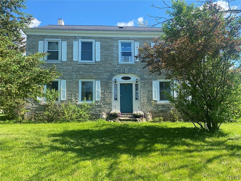 Enjoy the quiet, private setting nestled in mature trees including 2 beautiful apple trees. This large house of native limestone is nicely styled in the Georgian tradition with an imposing front entrance with graceful, keystoned arch and central hall. Inside you'll find two original fireplaces, a stylish, effecient kitchen that leads to the formal dining room. Folow the short hall into the the beautiful living room complete with a large stone fireplace plus a custom bar. Follow the hall to the half bath and then continue to the kitchen and back door. Upstairs you will find four ample bedrooms and two full baths. Down the hall is a walk up, floored attic for storage. 13 acres includes some permanet fenced pastures, good for horses or livestock. There is two semi permanent stalls in the garage plus a temporary stall. There's two refrigerators, the one by the kitchen fireplace does not stay. Includes second parcel #224889-064-000-0001-008-100 (vacant land)