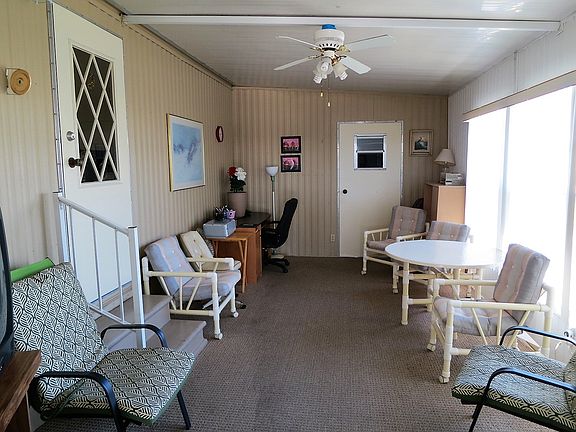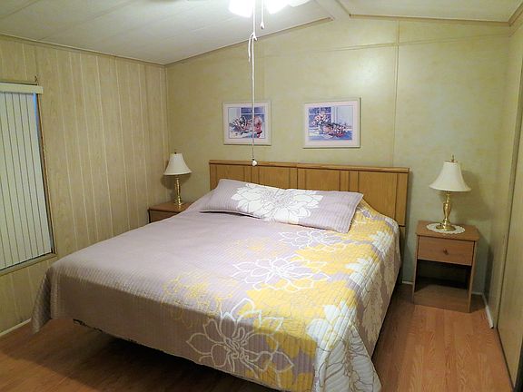 Exceptionally Clean and Fully Furnished!!! Highly desirable front and rear bedroom layout with peaked ceiling making this single wide feel open and spacious!!. Home features side glassed Florida room with attached shed leading to back patio area as well as two full baths. Many upgrades throughout such as counter tops, deep kitchen sink, laminate flooring, ceiling fans. Fridge is only two years old and both bedrooms have mattresses bought new one year ago. This home has laundry area in hallway with newer washer. Hurricane shutters are perfect for securing home especially at the end of the season. **This home is not located in the pet section