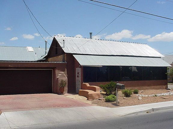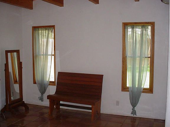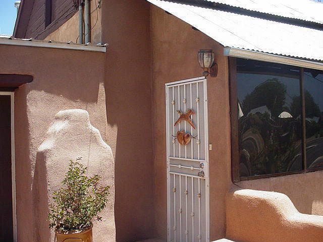 Superby maintained Northern New Mexico home. Thick adobe walls, beams, vigas, nichos and pitched metal roof. Gleaming saltillo tile throughout. Remodeled kitchen with breakfast bar, custom tile, new light fixtures and stainless gallery appliances. Separated master suite with updated bath including jetted tub and secluded patio. Hall bath has dual shower heads. Beautiful stained glass, large cedar closet and numerous builtins. Two-car 'garage port'. Fully walled private backyard. Enclosed front porch not included in SF. Plenty of Wall to Wall Charm!