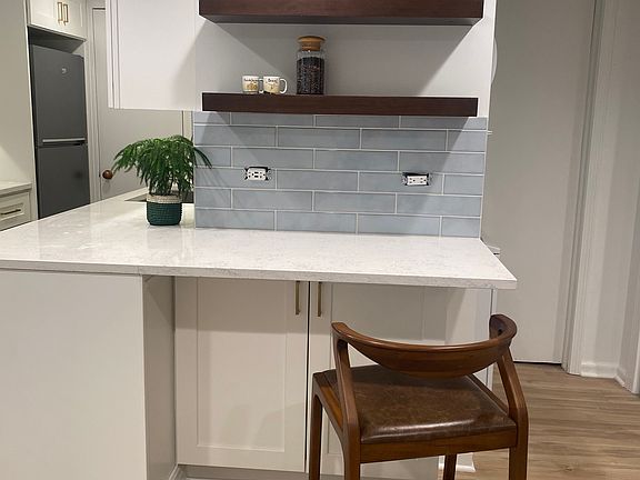 Kitchen: NEW custom quartz countertops and porcelain backsplash; new appliances, double pantry. Floating Pottery Barn walnut shelving over breakfast bar /workspace w USB-A and UBS-C outlets. Micro, gas stove, dishwasher.