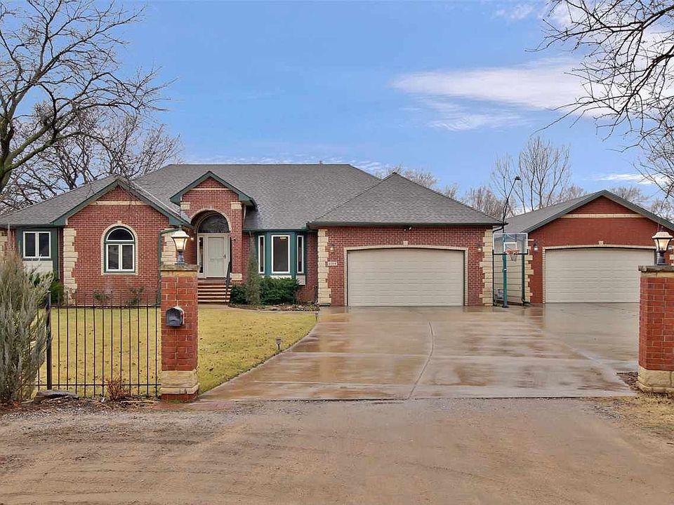 Welcome home! Spacious 4 BR, 4 BA ranch is nestled on a 0.46 acre lot at the end of a quiet cul-de-sac in desirable Benjamin Hills. Overlooking the Arkansas River, this property showcases a three car tandem attached garage and a 20' x 50' detached garage which can hold 4 cars or your favorite recreation vehicles. Enjoy formal dining, two fireplaces (one woodburning), main floor laundry, wood floors, an eating bar, induction cooktop, neutral decor, vaulted ceilings, large bedrooms, four full bathrooms, abundant built-ins, a fully finished walkout basement, expansive partially covered deck, fenced backyard, sprinkler system and an irrigation well. Entertaining is made easy in an exceptional basement featuring a sunken family room, stone fireplace, generous wet bar with built-in stools, billiards area, rec room, built-in desk, bedroom, full bathroom, concrete storm shelter area and storage. Sit back and watch the sunset, look at wildlife on the river bank and listen to the calming sound of flowing water from your own backyard; the 10 mile exercise path along the river is only a few steps away. The hobbyist in the family will fall in love with the detached garage with built-in shelving and the endless possibilities that it offers. The convenient location is within minutes of the Zoo, Botanica, Exploration Place, Riverside Park, downtown and highways. Quality built and carefully maintained, this one-of-a-kind property offers a rare opportunity for a nice home, unparalleled views and fabulous storage.