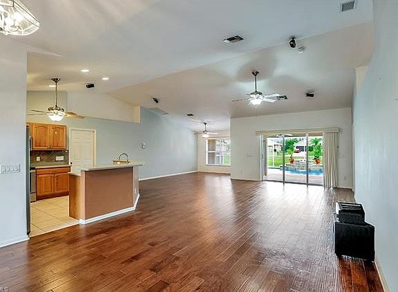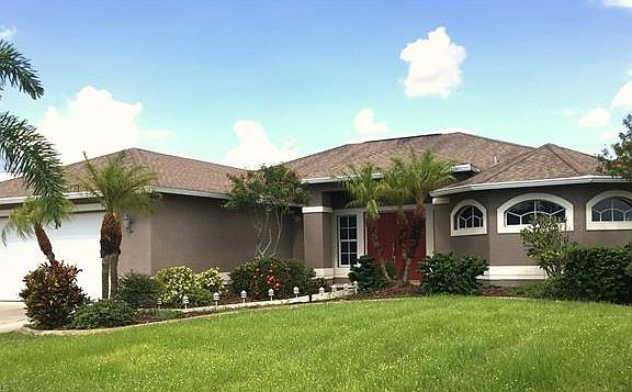 Beautifully landscaped for great curb appeal, an oversized (triple) lot, assessments in and PAID, Fountain-feature pool AND for your four-legged friends, a fenced in space to run and play. This lovely home has all the necessities and more! "Roomy" at just over 2,100 square feet, featuring an open concept kitchen, and great room with a view to the large screened in lanai and pool, you won't miss a minute of the family activities. With extra large bedrooms, your family and guests will be comfortable in their private space. A large master bedroom, his and her closets, jetted tub, walk-through shower, and 2 separate sinks are features you're sure to enjoy. From your master bedroom, you'll enjoy private access to that refreshing pool, where you can float your cares away. Location, location, location... in a pretty & growing neighborhood, with easy access to Veterans Parkway, you are just minutes from shopping, dining and any activity Cape Coral has to offer. Ideally located, easily make your way to Pine Island where you will enjoy local fishing, dining and shopping. Drive over the bridge and you're on the way to the world renowned beaches of Fort Myers, Sanibel, and Captiva.