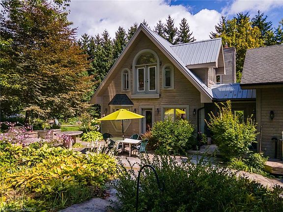 This wonderful country home in the heart of Beaver Valley has been loved by one family since 1988. Located on peaceful Bowles Bluff Rd. in an area of fine homes and chalets, the property is walking distance to the BVSC and close to all the 4-season amenities in the area. Seller has plans to travel and enjoy new adventures and is highly motivated, all offers will be considered and closing dates are flexible. This home is built into the slope of the valley with a lower level front entrance to a large foyer leading to the downstairs living area with in-law suite and separate kitchen, 1 bedroom and 3 piece bath. From the downstairs foyer you head up the stairs to the second level which features a beautiful open concept layout with a bright country kitchen & living room with wood fireplace. The balance of the main floor flows into the extension over the 3 car garage. This design layout offers the possibility of main-floor living with a large master and private bath from the great room with hardwood floors throughout. The deluxe master suite on the upper floor is beautifully designed with cathedral ceiling, twin balconies and private 5 piece spa ensuite. The unique layout of the home has 3 Beds and 4 Bath design, however a 4th bedroom can be easily accommodated on the main floor (see floorplan in the photo gallery) for larger families. Main floor features include 9' ceilings with soaring 12 foot large windows and walk-outs on all sides of the home. Property has an STR (Short Term Rental) license and has been very successful over the years. The exterior rear patio and wrap-around deck feature a full outdoor kitchen, and fireplace built of stone, lovely perennial garden and mature trees, private from neighbours and the road. Listing agent is related to the seller and familiar with the property to answer all your questions. The attached 3-car garage is 30' deep and can accommodate cars, trucks, boats, ATVs, Snowmobiles or additional storage as you need.