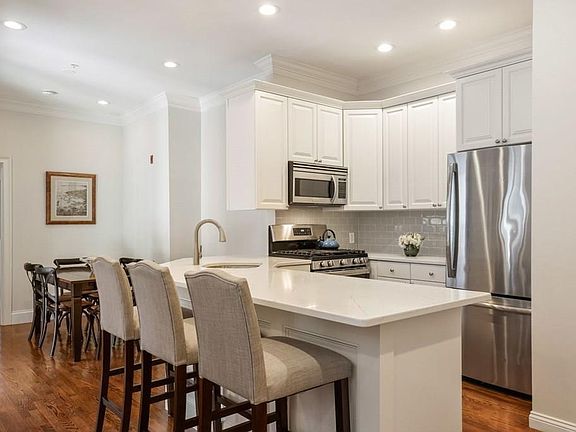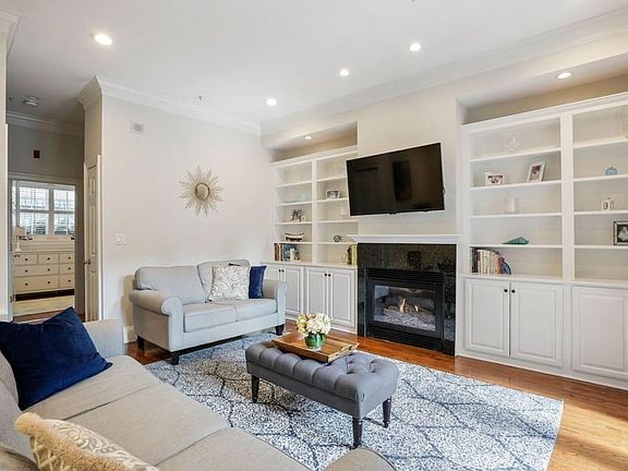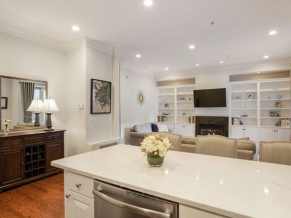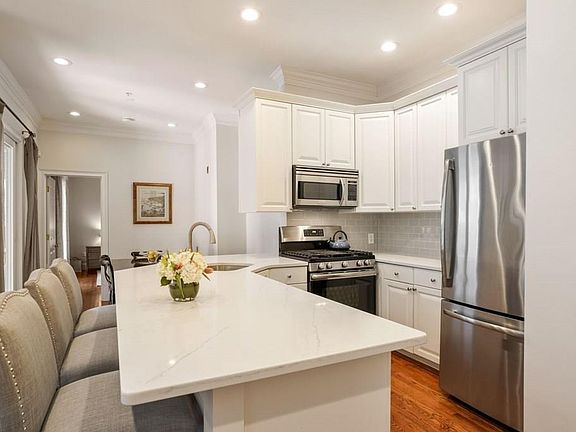 This spectacular 3BR/2BA first floor condo features 1,225sf of living space, an ideal layout, and one car parking. The spacious living room with soaring 9'8" ceilings and a gas fireplace, flanked by custom built-ins, opens to a beautifully updated chef's kitchen with white cabinetry, quartz countertops, stainless appliances, and a peninsula w/bar seating. Tucked off the kitchen is an elegant dining space w/glass slider to an enormous enclosed patio w/decking. Additional glass sliders lead from the deck into the living room and master bedroom, creating a seamless transition between indoor and outdoor living. The master bedroom offers a large closet and en-suite bath w/Jacuzzi tub and separate shower. Two generous bedrooms, each w/doublewide closet and windows w/plantation shutters, and a full bath w/tub complete this home. Distinctive features include: intricate crown molding, gorgeous walnut stained hardwood floors, an entry foyer, in-unit W/D, central HVAC (2018), and basement storage