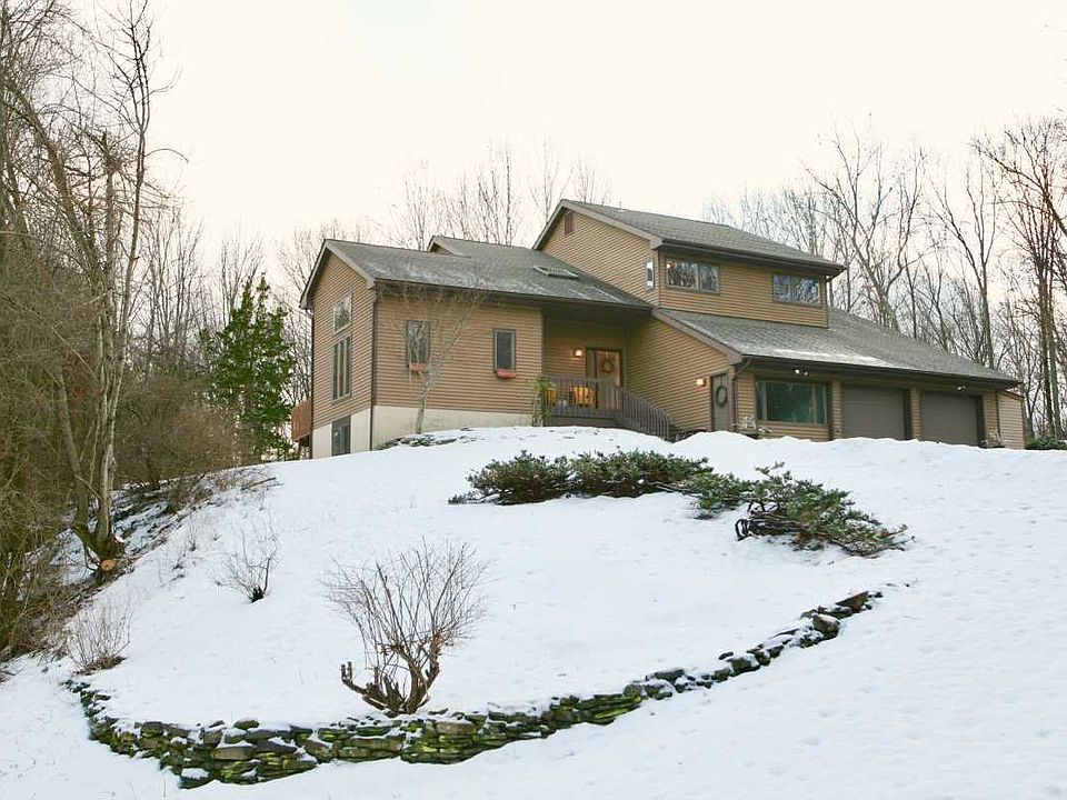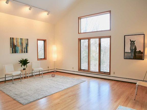 Exceptional updated custom contemporary in like-new condition on 6+ private acres set high in a world of its own. Enter into open cathedral ceiling foyer to a gracious open flow of common rooms with refinished oak floors, huge Andersen windows, soaring ceilings and floating staircase. Upscale cook's kitchen with custom cabinetry and new stainless appliances opens to both sunken family room and new gorgeous 4 season sun room which in turn opens to extra large stone patio that connects to the deck off living room. 3 1/2 brand new, stylish white baths with new oak floors with premium vanities & fixtures, new paint throughout. Finished room on lower level with additional art studio room and large additional room for storage. Attached garage is oversized with very high ceilings and additional storage loft. The style is current, the condition is move-in, the construction grade is premium and the site is absolutely special.