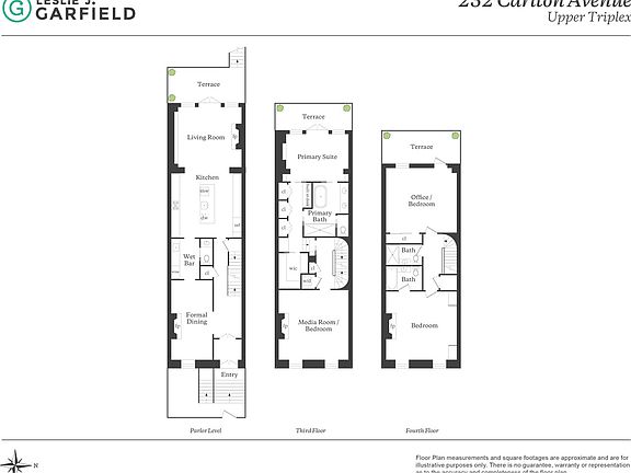 232 Carlton Avenue offers a mint-condition, renovated townhouse triplex set on one of the best blocks in Fort Greene. Heralded by Architectural Digest, Vogue, Brownstoner, and Design Anthology for its spectacular reconfiguration and imagination, this unit is a completely overhauled 3-bedroom, 3.5-bathroom home sporting three multi-level terraces and a lush rear yard. Available immediately and fully furnished with the highest-end custom pieces. Upon entering the parlor floor, two towering double-arched doors stand at the marble foyer. The entry hall is characterized by its high ceilings, herringbone white oak flooring, and striking detailing. To the left is a tasteful dining room just off a remarkable chef's kitchen which leads into a sundrenched living room in the rear. This stylish space features a fluted cylindrical gas fireplace and a glass-paneled rear wall that looks out on an outdoor terrace above the garden. On warm days, the space allows for easy and cohesive movement between the kitchen, living room, back patio, and garden the perfect space for entertaining. The chef's kitchen boasts custom cabinetry, a large pantry, and a grand marble island with waterfall edges. The home is equipped with high-end appliances like a Fisher and Paykel refrigerator, double-drawer dishwasher and a 36-inch ILVE stove with a 6-burner range and custom hood. The kitchen also has a wet bar and a server's pantry area, which sports a marble countertop, custom shelving, and a built-in wine fridge that can hold up to 48 bottles. A small powder room conveniently sits between the kitchen and dining room. The second floor features the luxurious primary suite, complete with walls of custom closets, a fitted walk-in closet, and a built-in desk. The primary bedroom exudes tranquility and luxury with its private sundeck terrace and a spa-like en-suite bathroom, featuring herringbone hardwood flooring, a custom double marble vanity with storage drawers, a deep soaking standalone tub, and an incredible marble double-head waterfall with glass-enclosed shower and Waterworks fixtures. This floor also includes an additional oversized bedroom, which is currently being used as a media room/lounge. The third floor is configured as two spacious bedrooms, each with its own skylit full bathroom. The front-facing bedroom's en-suite bath contains cement grey tiling, a deep soaking tub, and elegant bronze fixtures. The second bedroom offers direct access to the home's third terrace and is complemented by another full bathroom with a glass shower, bronze fixtures, and white/black tile floors. This extraordinary townhouse is complemented by a central Nest A/C and security system, designer furniture and light fixtures, a built-in Sonos surround sound system, recessed lighting with dimmer switches elegantly adorning every space, a washer and dryer set for convenience, ample storage space, and high-end finishes that set it apart from the rest. 232 Carlton Avenue is located in a prime location, close to the Atlantic Terminal, BAM, only moments from Fort Greene Park, and numerous restaurants, bars, and shops. Manhattan is also just a quick subway or car ride away. An opportunity like this cannot be missed - Fort Greene is one of Brooklyn's most coveted neighborhoods and mint-condition homes built to this standard of luxury rarely come available for lease.