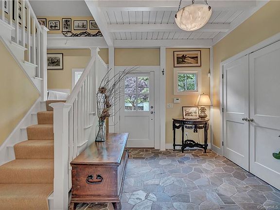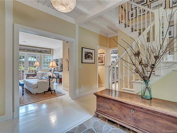 Extraordinary opportunity to purchase the iconic and exquisite "Burrit's Barn". This magnificent lofted home underwent an all encompassing, down to the studs renovation in 1999, and has since benefited from many further beautiful updates by the current owner, creating a fresh, modern vibe for today's lifestyle. Located in the sought after Compo Beach area, this converted barn is set back behind stacked stone walls, and from the moment you pull into the circular driveway, you will fall in love with this exceptional home. The main level houses the 725 sq ft great room with wide plank floors, dramatic beams, grand, wood-burning stone fireplace and soaring, vaulted ceilings. Renovated chef's kitchen features extensive custom cabinetry, upscale finishes and light filled dining area with French doors leading to the tranquil deck and pretty garden. The family room is another wonderfully comfortable space with fireplace, french doors and custom built in desk and cabinetry. Upstairs you will find the master bedroom with fireplace, updated master bath, 3 further bedrooms and renovated full bathroom. Such a terrific location to experience all that neighboring Longshore Park has to offer with its golf course, tennis courts, pools and sailing school and walk or bike down to Compo beach and marina to catch the sea breezes. And just over the river you will find NY Times reviewed restaurants and the Saugatuck Rowing Club. Walk to train in just 10 mins (0.8 miles and only 50 miles to NYC