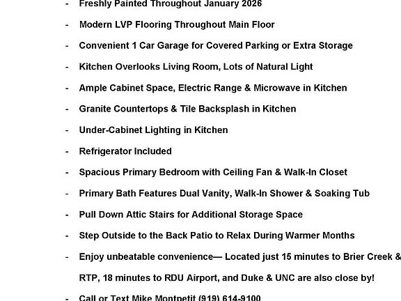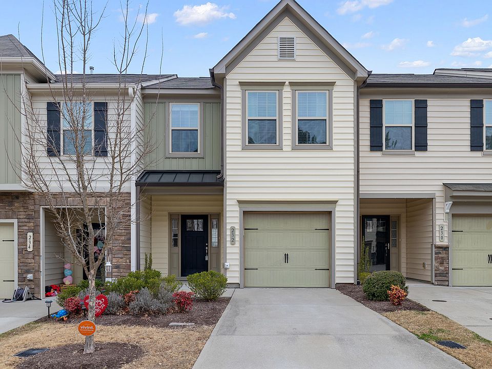 Enjoy unbeatable convenience in this move-in-ready townhome ideally located just 15 minutes to Brier Creek and RTP, and only 18 minutes to RDU Airport—perfect for easy access to work, dining, and shopping. Step inside to a bright, freshly painted interior and an open floor plan that offers seamless flow from the kitchen to the living room, ideal for everyday living and entertaining alike. The kitchen is thoughtfully designed with granite countertops, a modern tile backsplash, stainless steel appliances, an electric range, and ample cabinetry. A main-level powder room adds everyday convenience, while the private back patio provides a perfect space for morning coffee or relaxing evenings outdoors. Upstairs, the spacious owner's suite serves as a true retreat, featuring a ceiling fan, large walk-in closet, and a well-appointed en-suite bath with dual vanity, soaking tub, and walk-in shower. Two additional bedrooms share a full hall bath, offering flexibility for guests, home office, or additional living space. An attached one-car garage provides added convenience and storage. This home offers the perfect blend of modern updates, comfort, and location, and is an excellent opportunity for both homeowners and investors. Brightleaf at the Park boasts resort-style amenities including a pool, tennis courts, walking trails, open green spaces, a clubhouse with fitness center, and playground. Schedule your private showing today and experience everything this vibrant community has to offer!