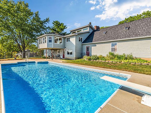 Sitting hilltop, overlooking an in ground pool and a retired apple orchard, this incredible home encompasses distant southern horizon views, and is located in a private, rural location, just on the outskirts of Lewiston. A few minutes from I-95, shopping, restaurants, golf courses, and more; it comes equipped with vaulted ceilings, showcases tons of natural light, has the ambiance of a beautiful stone fireplace, an in-law apartment, a four car garage, and a wood shop that could stay just that, or could easily be transformed into a primary suite if your heart desires. A great detail on the in-law apartment is that it could have what you'd consider to be its very own dedicated entry, as well as garage too, and it's ground level with easy access to the pool. This property has much to offer, from views, to THE perfect backyard for a BBQ, to a living space that provides everything you could ask for and MORE in a home.