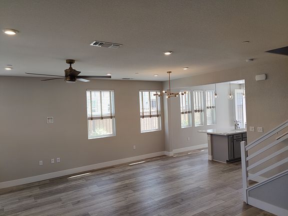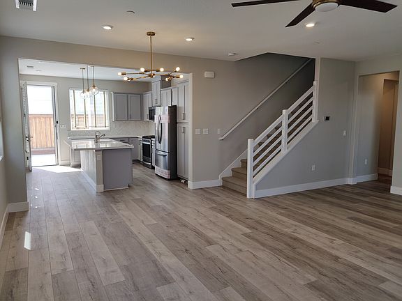 500 off first month's rent for qualifying tenant.** Northeast facing home featuring soft-close kitchen cabinets, upgraded appliance package, French door refrigerator, and upgraded countertops. The great room features a remote-operated ceiling fan; the dining area and kitchen have upgraded lighting. Durable luxury vinyl planking throughout. Full bedroom and bathroom downstairs. Upstairs, you will find premium stamped carpeting and a versatile loft area separating the master suite from 2 bedrooms that share a dual vanity bathroom. The laundry room is equipped with a premium front load washer and dryer. To the spacious master suite, the owners have added a ceiling fan and a barn door entrance to the master bathroom. The backyard features a gas stub and is landscaped with stenciled concrete; as well as nectarine, persimmon, pomegranate, and mandarin trees. This home is equipped with owned solar panels, R.O. filtration - drinking water system, and water softener system. Renter is responsible for water, gas, electricity, and garbage. No tobacco nor marijuana smoking allowed. First and last month's rent due at signing.
