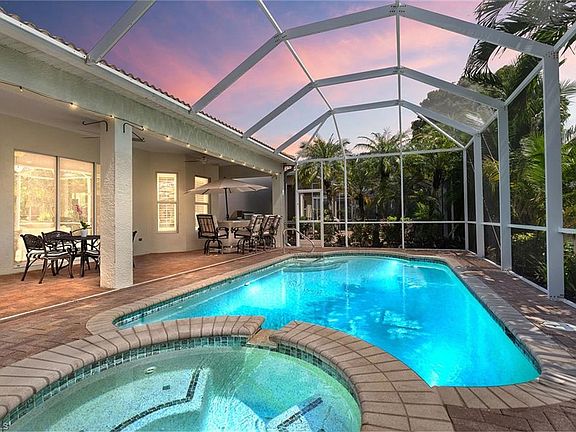 Rarely available Portofino model in Glen Eagle Golf & Country Club, this two-bedroom plus den, two-bath Naples pool home offers 2,124 square feet of refined living with crown molding, coffered ceilings, plantation shutters, tile roof and two EV chargers. The open floor plan extends to a private lanai with a heated saltwater pool, spa, screened enclosure and custom LED lighting, an outdoor retreat designed for year-round enjoyment. The primary suite features coffered ceilings, a walk-in closet and direct pool access for seamless indoor-outdoor living. A Social Membership is included, providing access to the clubhouse, dining, fitness center, tennis, pickleball, bocce, community pools and a full calendar of events, with golf available May through September. Located in a gated Naples golf community just minutes from 5th Avenue South, Naples Pier, Gulf beaches, luxury shopping, and fine dining, this residence offers resort-style amenities and the ultimate Florida lifestyle, ideal for seasonal or full-time living.