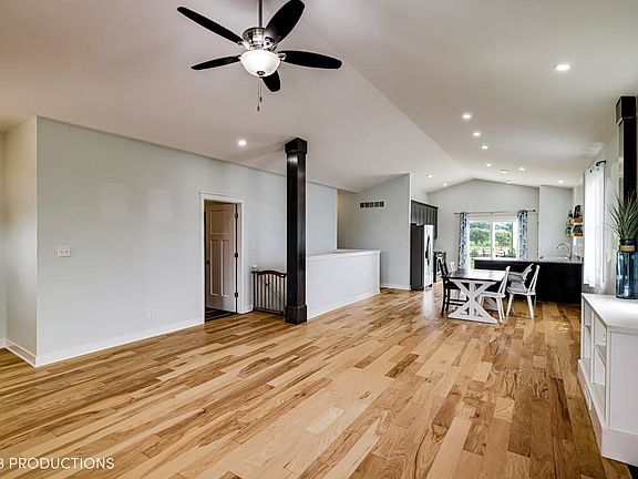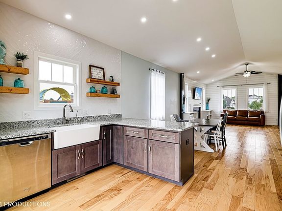 Gorgeous farmhouse style ranch home with upgraded architectural trim work and open concept living, kitchen, and dining area with cathedral ceilings- 9ft. Kitchen with farmhouse sink & granite, dining, and living features engineered hardwood floors. Owner's suite has double bowl vanity, 5' shower, and large walk-in closet. Unfinished basement has roughed-in plumbing and egress window which can easily be made into extra living space to create just under 4000 SF of living area. Includes 12' X 10' patio and generous landscaping lawn. Energy Smart Home with Hi-Eff furnace. Insulated and finished 3-car garage. This is the home you have been waiting for, picture perfect ranch home, three car garage, full basement and a great view with privacy.