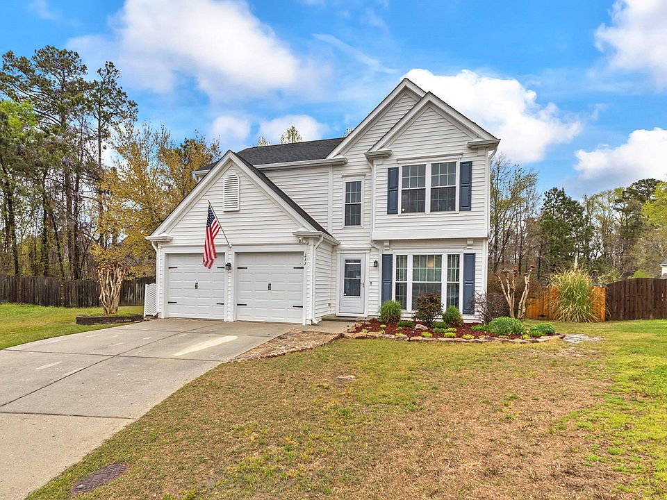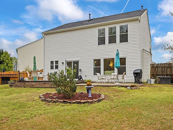 Cul-de-sac home with fantastic fenced back yard! Four bedrooms + 1st floor private office. Light and bright updated kitchen with island, backsplash and fridge that stays. Gas fireplace and lots of sunlight in large family room. Four spacious bedrooms upstairs with ample closets. Owners suite has a vaulted ceiling and large walk-in closet. FRESH PAINT through entire interior! Flat back yard boasts a large deck, fire pit, storage shed and wooded buffer for privacy. Community is across the street from Honeycutt Playground & Park and Clubworx. Two minutes to grocery, medical, dining options. Lawn weed service paid for through next January. Warranty on the windows and roof.