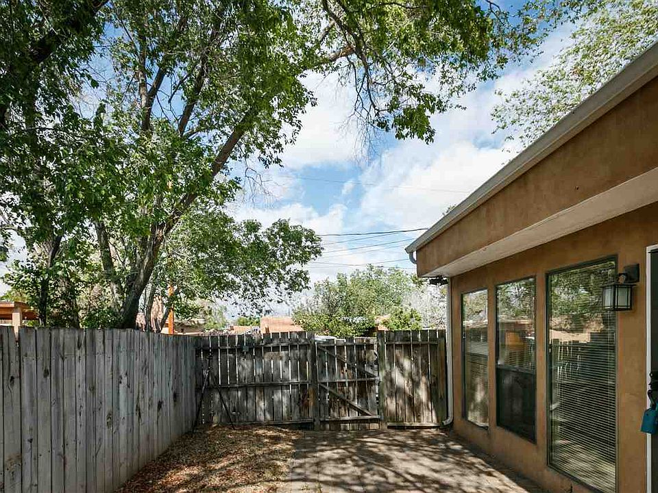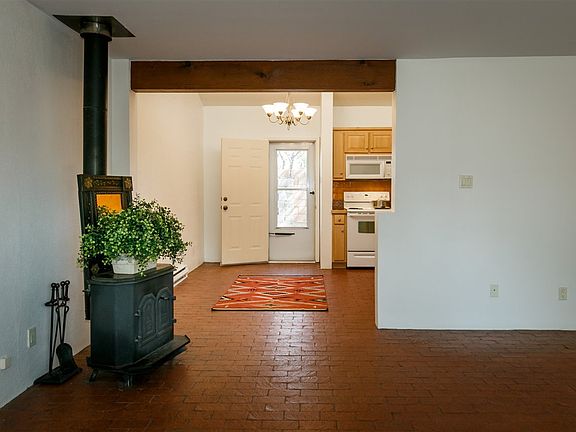 Desirable end unit with one common wall. Passive solar home with lots of Santa Fe flavor. Open floor plan features brick floors, updated kitchen cabinets and appliances, stackable washer/dryer, private fenced courtyard and back patio. Great in town location within blocks of the Plaza and Guadalupe areas. Two off street parking spaces.