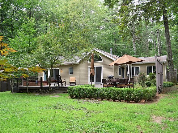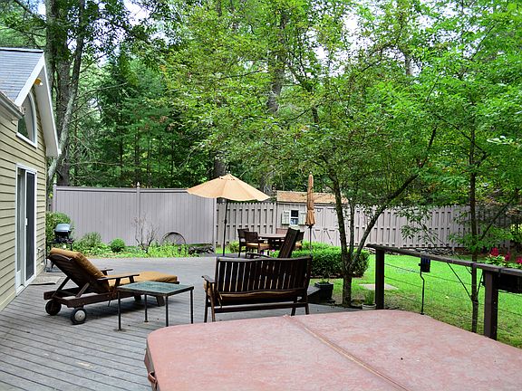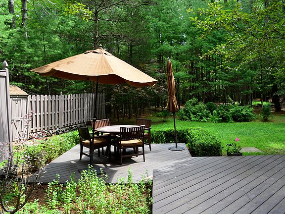 This turnkey Catskill retreat is a marvelous showcase of space-efficient and high quality custom design by Woodstock-based architect Les Walker. Just 10 minutes from the center of Woodstock, this ship-shape home had extensive renovations in recent years. Improvements include 2016 furnace and central air, Pella casement windows, new gutters with gutter guards, modern kitchen with high-end appliances (Sub-Zero fridge, Bosch built-in range/oven, Fisher & Paykel dishwasher drawer), granite counters and sink, skylights, and gorgeous cherry cabinetry maximizing every inch of storage space. Generous dining area has a built-in daybed with lookout window to the backyard. Bright and airy living room with an Avalon Prairie propane stove. Slider opening to the 1,000 sq ft deck with a 6 person spa hot tub, lounge and dining areas overlooking a lush yard protected by deer fencing. Private ensuite master wing, also with deck access, with an abundance of windows, large closet and two built-in desks. Second gorgeous bath with tiled shower, Kohler vessel sink, wainscoting and a cabinet for stacked washer/dryer. The perfect getaway with easy access from NYC. This home is a joy, make it yours!